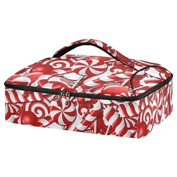 Show moreIntroducing the WIFIU Insulated Casserole Carrier, a delightful solution for transporting your favorite dishes with style and convenience! Designed for food lovers, this carrier features a vibrant Christmas candy cane pattern that adds a festive touch to all your gatherings. Constructed from durable 600D Oxford cloth, it boasts waterproof capabilities that make it easy to clean with just a damp cloth. The heavy-duty cotton handle is designed for ultimate comfort, ensuring a secure grip as you transport your meals with ease.