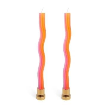 Show more Illuminate your space with the unique charm of the Wiggle Candles, where artistic design meets functionality. Crafted by renowned designer Lex Pott, these taper candlesticks have a playful wavy shape that captures attention and injects a joyful spirit into any room. Sporting vibrant colors that feel alive, these candles are not just sources of light but delightful decor pieces. At 7/8” in diameter and 11” in length, they fit standard candleholders perfectly, allowing for versatility in display. Made in the USA from high-quality paraffin wax, they promise durability and an exquisite burn experience that makes each lighting feel special.
