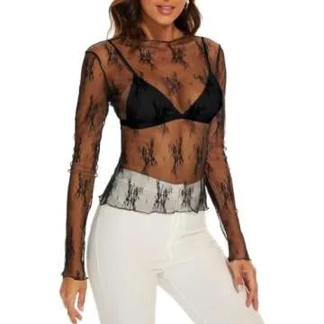 WIHOLL Womens Fashion 2024 Tops Black Lace Long Sleeve Sheer See Through Lace Floral Going Out Layering Shirts S