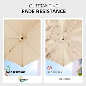 Show more This incredible market umbrella by Wikiwiki is designed to transform any outdoor space into a personal oasis, providing both style and functionality. With an upgraded eco-friendly and recycled fabric, this umbrella features a GRS certified canopy made of recycled Polyester Draw-Texturing-Yarn. Thanks to the PU coating, it offers exceptional colorfastness to light with an impressive US Standard AATCC 16 Grade 5 rating. Enjoy the peace of mind of knowing that the high-quality materials not only elevate your outdoor decor but also offer excellent UV resistance.