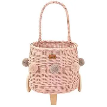 WIKLIBOX Rattan Pully Toy Basket - Handcrafted European Wicker Luggy Toy Storage - Natural, Durable & Stylish Organizer - Perfect for Kids' Rooms, Nurseries & Playrooms | Pink with Pom Poms