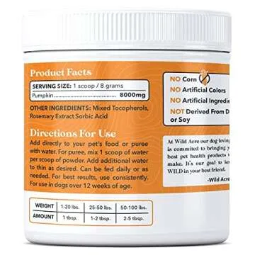 Show more Introducing a revolutionary way to pamper your furry friend with our Pumpkin Powder Dog Fiber Supplement; a product crafted with love and care to enhance your dog's digestive health. This unique supplement is packed with soluble fiber, making it an ideal solution for dogs suffering from digestive troubles such as scooting and irregular stool consistency. Support your dog's digestive journey with the wholesome goodness of pumpkin, a natural and delectable ingredient known for its beneficial properties. It's easy to use, safe, and highly effective, helping you achieve a healthier, happier pup.