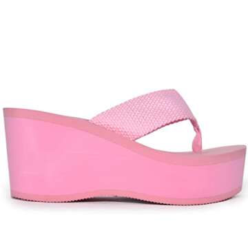 Show moreStep into summer with the Wild Diva Women's Heat High Platform Wedge Flip Flop Sandals in eye-catching Pink! These sandals embody the essence of Y2K fashion while providing the utmost comfort for your sun-soaked adventures. With a stylish woven fabric upper and trendy thong style construction, these sandals offer a secure fit that is as chic as it is practical. The 1 3/4" platform and 3 1/8" heel elevate your style, adding a touch of glam to any beach ensemble, dresses, shorts, or skirts. Crafted with lightweight EVA material, these sandals ensure freedom of movement while keeping your feet cushioned and comfy throughout the day.
