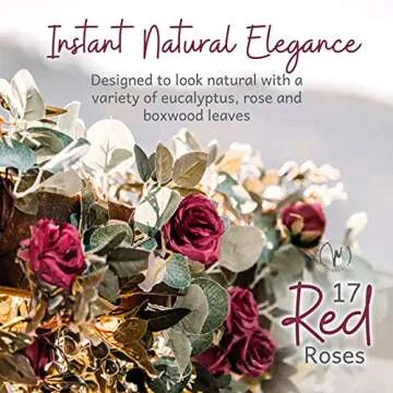 WILDIVORY Eucalyptus Garland with Flowers - 17 Red Roses - Lush, Natural Looking Eucalyptus and Flower Garland Decor, Floral Garland Greenery for Wedding Table Decor with Abundant Vines, Rose Leaves