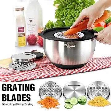 - Grater Inserts: Three versatile grater attachments (slicing, grating, and shredding) fit snugly into the lid of the largest bowl, providing convenience when grating your favorite ingredients.