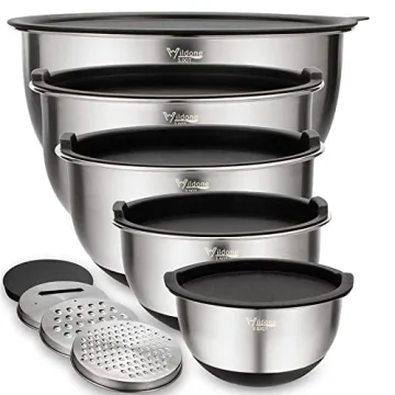 Show more Introducing the Wildone 5-piece Mixing Bowl Set, a quintessential addition to any kitchen! Designed for the home chef, this set includes five versatile mixing bowls in sizes of 5, 3, 2, 1.5, and 0.63 quarts, providing the perfect tools for measuring, mixing, pouring, and serving food—all in one beautifully constructed package.