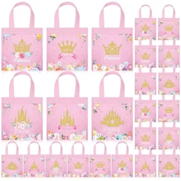 Show moreUnlock the magic of every celebration with the WILLBOND Princess Party Favor Bags, your go-to solution for enchanting party decorations! This fantastic set includes 24 reusable princess tote bags designed specifically for all your special occasions. Each bag features a unique floral princess-themed design, showcasing stunning gold glitter crowns, dreamy castles, and whimsical 'Princess' text that will delight every young girl. Perfectly sized at 7.87 x 7.87 inches, these bags not only add a touch of elegance to your party décor but also serve practical storage needs for party favors and small gifts, ensuring happy memories are made as your guests leave with their treasures. Delight in the superior craftsmanship and thoughtful design of these party bags, as they create a beautiful backdrop for any princess-themed celebration.