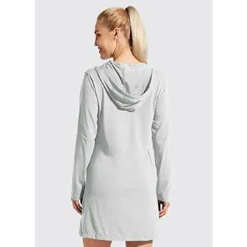 Crafted from UPF50 fabric, it provides excellent protection against the sun's harmful rays, helping you enjoy a day out without worrying about sunburn. Whether you're traveling, relaxing by the oceanside, or simply enjoying an evening stroll, this dress is your perfect companion. The hooded v-neckline with drawcord functionality protects your ears and neck, ensuring complete coverage from direct sunlight.