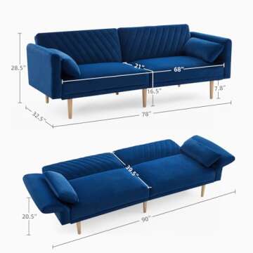 WILLOVE 78'' Velvet Futon Sofa Bed, Convertible Sleeper Bed with Adjustable Armrests and Backrest, Loveseat Sleeper Sofa with 2 Pillows, Modern Futon Couches for Living Room, Blue