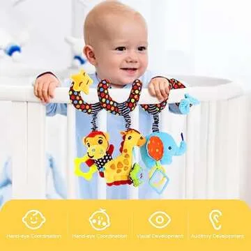 The toys come with a convenient spiral design that easily wraps around car seats, strollers, bassinets, and crib rails.
