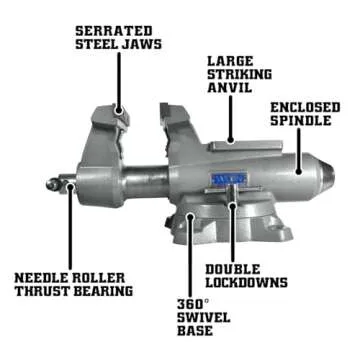 The needle roller thrust bearing integrated into the vise delivers maximum clamping force with less effort, making heavy-duty jobs feel effortless. With the innovative swivel base that rotates a full 360 degrees complete with double lockdowns, you can position your work at the most convenient angle, enhancing your working experience. Its large anvil work surface is perfect for a variety of striking needs, allowing for both heavy work and precision tasks with ease. Wilton stands by its commitment to quality, which is why this vise is backed by a lifetime warranty against manufacturing defects.