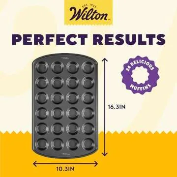 Show moreIntroducing the Wilton Perfect Results Premium Non-Stick Pan 24-Cup Mini Muffin Tin – a kitchen essential for every baking enthusiast! Whether you're celebrating a special occasion or just satisfying your sweet tooth, this versatile mini muffin pan is designed to create delightful baked items effortlessly. Made with durable steel and coated with a high-quality non-stick finish, this 24-cavity muffin tin ensures that each treat bakes evenly and releases easily, so you can enjoy baking without the worry of sticking or crumbling.
