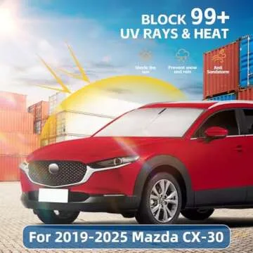 Show more Introducing the ultimate protection for your Mazda CX-30 from 2019 to 2025 - the Windshield Sun Shade by AuyNeas. This precisely designed sunshade ensures a perfect fit for your vehicle's front windshield, eliminating the need for suction cups. It is custom-made to seamlessly contour to the unique shape of your CX-30, providing unbeatable sun protection and a comfortable driving experience. The upgraded double layer of 240T reflective fabric and PEVA aluminum foil significantly enhances heat insulation, reflecting harmful UV rays and keeping your vehicle's interior cool.
