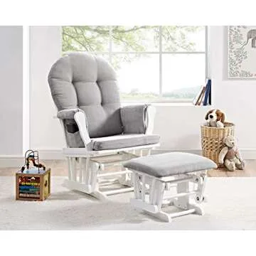 Show moreThis exquisite Windsor glider and matching ottoman set is designed to provide an unparalleled experience of comfort while adding a touch of elegance to any room. The white finish paired with stunning gray cushions creates a stylish yet calming aesthetic, ideal for nurseries, living rooms, or any cozy corner in your home. With generous seating room and padded arms, this chair invites you to sink in and relax, making it the perfect place to cuddle up with a good book or rock your little one to sleep.