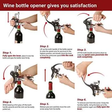 Simply squeeze the clamp around the neck of the bottle, push the lever to insert the screw into the cork, and pull back to remove the cork effortlessly.
