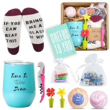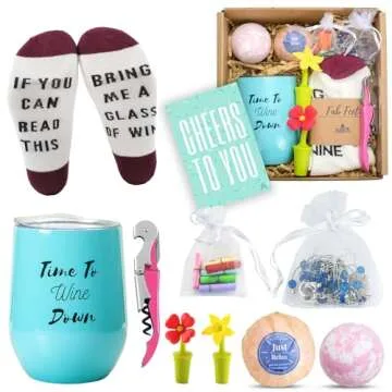 Each gift box is beautifully packed, revealing a "Cheers To You" greetings card nestled atop a charming bed of tissue paper. This thoughtful touch enhances the unwrapping experience, ensuring that the recipient feels truly special. Explore the delightful contents: a triple insulated wine tumbler with spill-proof lid perfect for outdoor sipping, luxurious bath bombs for a relaxing soak, adorable wine charms that add a touch of whimsy to gatherings, super comfy socks to keep your feet cozy, silicone flower wine stoppers to preserve your favorite bottles, and an ergonomic pink corkscrew for effortless opening.