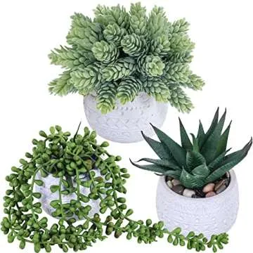 Show more Welcome to the unique world of the Winlyn 3 Pcs Assorted Small Potted Succulent Plants. This set features three exquisite faux potted succulents, each carefully crafted to mimic the beauty of nature. Inside each sturdy, unglazed concrete ceramic pot with chic geometric patterns, you’ll find an assortment of tantalizing plants—vibrant Aloe, delicate String of Pearls, and lush Sedum Hops. The combination of natural textures and striking greenery makes this set the perfect addition to elevate the decor of any space, whether it be a cozy home, bustling office, or serene outdoor setting.