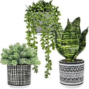 Show moreIntroducing the exquisite Winlyn 3 Pcs Small Potted Plants Set, a perfect blend of elegance and practicality that enhances any space. This collection features three stunning faux succulents, including the captivating string of pearls, the soft-textured hops succulent, and the iconic snake plant, all housed in beautifully crafted black geometric ceramic pots. Each pot is a masterpiece, uniquely textured to provide a contemporary aesthetic that complements a variety of home or office decors. Measuring between 6” to 9.8” tall, these small potted plants fit perfectly on desks, shelves, or windowsills without overwhelming your space, allowing you to enjoy nature’s beauty wherever you go.