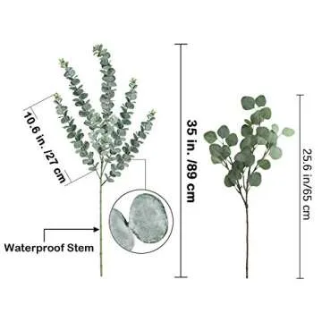 Show more Transform your living spaces with the exquisite Artificial Eucalyptus Leaves Stems. This stunning set comprises 6 pieces of lush greenery, featuring 3 grey-green silver dollar eucalyptus stems and 3 frosted green baby eucalyptus branches. Standing approximately 35 inches tall and 25.6 inches for the smaller stems, these elegant faux plants are designed to add a touch of nature to your home or event decor.