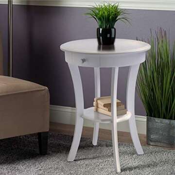 Show moreIntroducing this stunning round wood accent table, a perfect blend of functionality and style for any home! Crafted with a strong and sturdy construction, this table boasts a beautiful traditional design that seamlessly fits into your interior décor. With its elegant white finish and polished steel drawer knob, it adds a touch of sophistication to your space. Measuring 20 inches in diameter and standing 27 inches tall, this accent table is ideal for small spaces and adds a functional yet aesthetic charm to your entryway or living room.