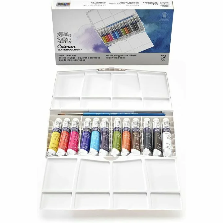 Compared to other watercolor sets in the market, Winsor and Newton Cotman Water Colours stand out for their combination of quality and affordability. Many sets priced similarly lack the transparency, vibrancy, and consistency offered by Cotman Water Colours. Additionally, the inclusion of a brush and the thoughtful design of the carrying case, featuring both built-in and removable palettes, add significant value that many competing products do not offer.