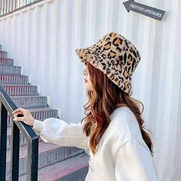 Winter Faux Fur Furry Leopard Beige Bucket Hat Fluffy Fuzzy Warm Hat Plush Fisherman Hat for Women Teens Girls