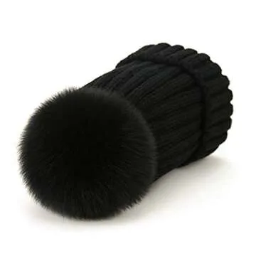Chic Winter Knit Beanie Hat with Genuine Fox Fur Pom Pom for Women and Girls (Black)