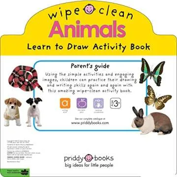 Show moreIntroducing the Wipe Clean: Animals, a fantastic addition to the Wipe Clean Learning Books series designed by Roger Priddy! This engaging book serves as an excellent tool for young learners eager to develop their drawing skills while exploring the world of animals. Children can enjoy the fun of creating art without the mess as they use the specially designed wipe-clean pages that allow for endless practice, innovation, and creativity. Each page is filled with delightful illustrations that not only captivate young minds but also encourage them to learn about different animals and their surroundings. Perfect for both solo play and guided activities, this book will spark creativity and inspire a love of learning in your little ones!