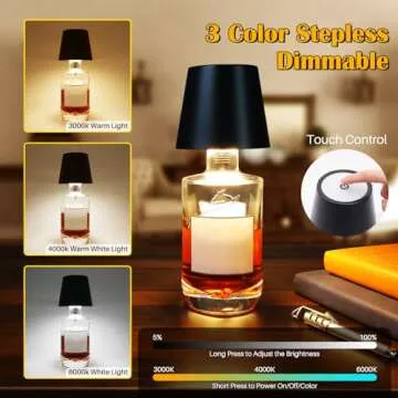Wireless Bottle Lamp, Adjustable Brightness 3 Color Wine Bottle Light with 2500 mAh Battery, Touch Control Rechargeable Metal Waterproof Table Lamp for Dining Room/Bedroom/Bar, Black