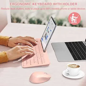 Show more Experience the perfect harmony of style and functionality with the WisFox Wireless Keyboard and Mouse Combo. Designed for those who appreciate a vibrant work environment, this stunning pink set not only catches the eye but also enhances your productivity in every click. The full-size keyboard features a U-shaped holder, designed specifically for your smartphone or tablet, allowing you to work comfortably without the need to constantly lean over. The set utilizes a seamless 2.4G wireless connection, providing a reliable range of up to 10 meters (33 ft) for worry-free multitasking.