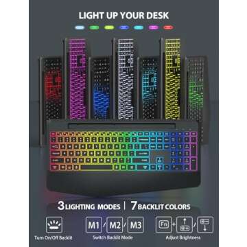 Wireless Keyboard and Mouse with 9 Colored Backlit, Wrist Rest, Jiggler Mouse, Rechargeable Silent Ergonomic Light Up Keyboard Mouse Combo with Phone Holder for Windows, Mac, PC, Laptop