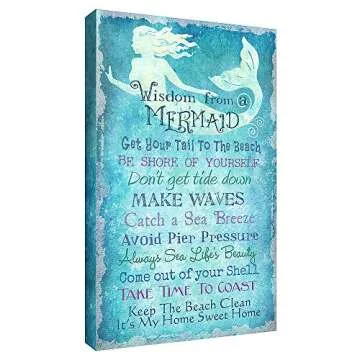 Show moreTransform your home into a whimsical underwater paradise with the "Wisdom From A Mermaid" canvas art! This stunning piece of wall decor adds a touch of nautical charm and humor to any space. Measuring 16 x 10 x 1 inches, the vibrant blue-green hues will bring the ocean’s beauty right into your living room, bedroom, or bathroom. It’s not just artwork; it’s a celebration of marine life and playful puns that will make you smile each time you see it.