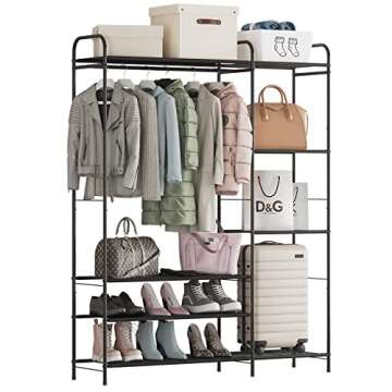 Show more Introducing the Wisdom Star Garment Rack with Shelves, your ultimate solution for stylish and functional clothing storage! Designed with versatility and practicality in mind, this free-standing clothes rack allows you to effortlessly organize your garments while enhancing your living space. Crafted from high-quality metal, its sturdy construction ensures all your clothes, coats, and accessories are securely held and easily accessible. With a sleek black finish, it seamlessly fits into any bedroom, bathroom, or commercial setting, providing much-needed organization without compromising style.