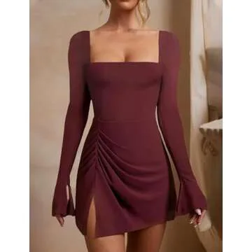 WISFRUIT Women's Sexy Square Neck Bodice Dress Long Sleeve Ruched Side Slit Party Club Mini Dress Wine Red Medium