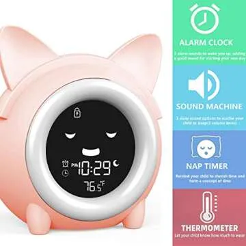 Show more Introducing the charming and innovative Wisoee Kids Alarm Clock, the perfect solution for both children and parents seeking a smooth transition into bedtime and morning routines. This delightful clock not only tells time but also aids in sleep training by using facial expressions and colorful lights to indicate when it's time for bed or when it’s okay to wake up. The distinct colors—Blue for Bedtime, Yellow for Almost Time to Get Up, and Green for Time to Get Up—make it both engaging and educational for kids.