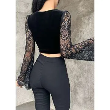 Show moreElevate your fashion game with our stunning Gothic Crop Top, meticulously crafted from a premium blend of 95% polyester and 5% spandex for unbeatable comfort and style. This trendy top features a super soft texture that enhances breathability and ensures a lightweight fit, perfect for everyday wear. The long sleeve design is adorned with exquisite lace sleeve patchwork, lending an elegant twist to the classic v-neck crop top. Made with luxurious velvet fabric, this versatile tee offers a touch of goth glamour that is sure to turn heads wherever you go.