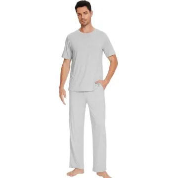 Show moreExperience the ultimate in relaxation with the WiWi Men's Pajama Sets crafted from an exceptional blend of 95% Viscose made from Bamboo and 5% Spandex. These pajamas are designed to provide a truly comfortable sleep experience. The buttery soft fabric feels great against the skin, while the lightweight material keeps you cool throughout the night. No more tossing and turning; enjoy peaceful slumber with a set that grows with you as it retains shape and fit thanks to its excellent durability and resilience. The classic ash grey color adds a touch of elegance to your loungewear, making it suitable for both lounging around the house and cozying up in bed.