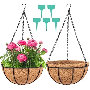 Wizdar 2PCS Metal Hanging Planters Basket with Coco Coir Liner 14 Inch Round Wire Plant Holder Porch Decor Flower Pot Hanger Garden Decor Watering Hanging Baskets
