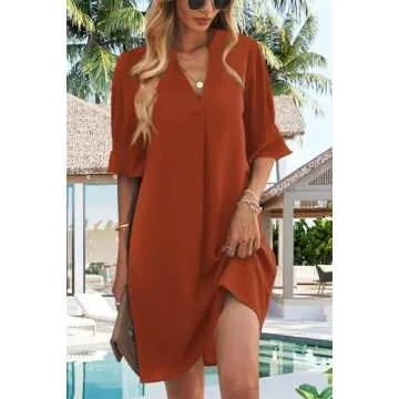 Wkior Short Sleeve Dress for Women V Neck Casual Loose Flowy Swing Shift Dresses in Brown XL