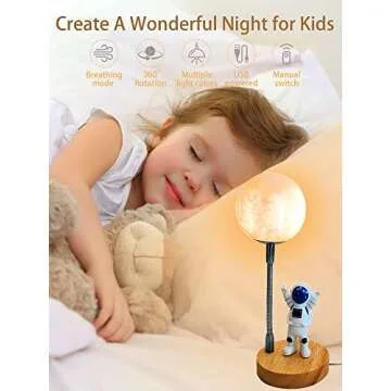 Show moreTransform your child's bedroom into a celestial wonderland with the WLHONG Moon Lamp for kids! This enchanting 3D Moon Astronaut Desk Lamp is more than just a light; it’s a gateway to dreams filled with cosmic adventures and imaginative play. Designed with a charming spaceman figure and glowing moon that shimmers in 7 vibrant LED colors, it creates a cozy atmosphere perfect for winding down after endless hours of exploration. Crafted from high-quality, eco-friendly materials, this lamp is not only durable but safe for children of all ages, ensuring countless nights of enchanting illumination.