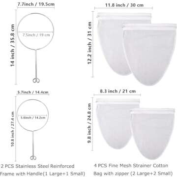 WMKGG Ultra Fine Mesh Strainer Bags, Reusable Mesh Filter Bags with Stainless Steel Handle Frame for Filter NutMilk, Coffee, Milk, Butter, Juices and Fresh Cheese (Large + Small)