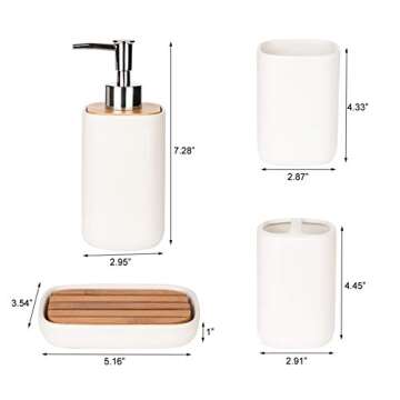 Show more Introducing the Wodlo 4-Piece Ceramic with Bamboo Bathroom Accessories Set, where luxury meets functionality in a beautifully crafted ensemble. Designed to elevate your bathroom decor, this exquisite set features high-quality ceramic adorned with an elegant bamboo design. Each piece adds a touch of sophistication and charm, ensuring your space remains stunning and inviting over time. The longevity of the material means you can trust this set to maintain its contemporary appeal, making it a lasting addition to your home.