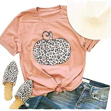 Woffccrd Womens Funny Leopard Pumpkin Printed Shirts Halloween Short Sleeve Graphic Tees Fall T-Shirts Tops (M, Orange)