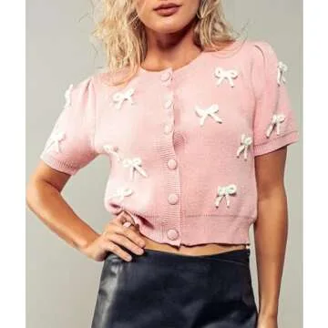 Woman’s Bow Cropped Sweaters Cardigan Y2K Short Sleeve Button Down Knit Sweater Pullover Cute Valentine's Day Sweater Pink