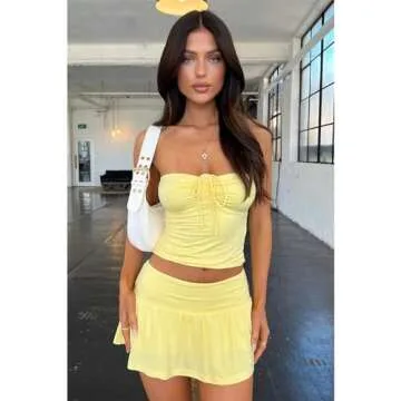 Women 2 Piece Mini Skirts with Short Set Summer Sleeveless Slim Tube Crop Tops Sexy Y2k Going Out Matching Outfits Yellow-S