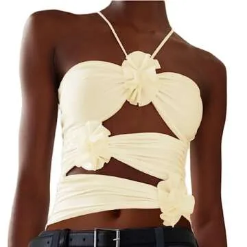 Women 3D Floral Tassels Tank Top - Y2k Flower Halter Tube Ruffle Top 2023
