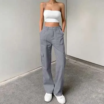 Women 6 Pockets High Waisted Cargo Pants Wide Leg Casual Pants Combat Military Trouser Blue Grey