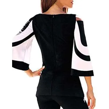 Women Blouses and Tops Black White Colorblock Bell Sleeve Cold Shoulder Top Shirt M