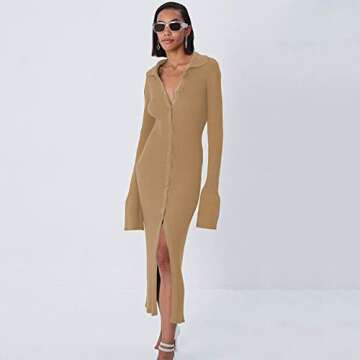 Women Button Down Knit Sweater Long Dress Vintage Long Sleeve V Neck Split Dress Casual Cardigan Outwear Sweater (Khaki,M)