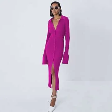 Women Button Down Knit Sweater Long Dress Vintage Long Sleeve V Neck Split Dress Casual Cardigan Outwear Sweater (Rose red,L)
